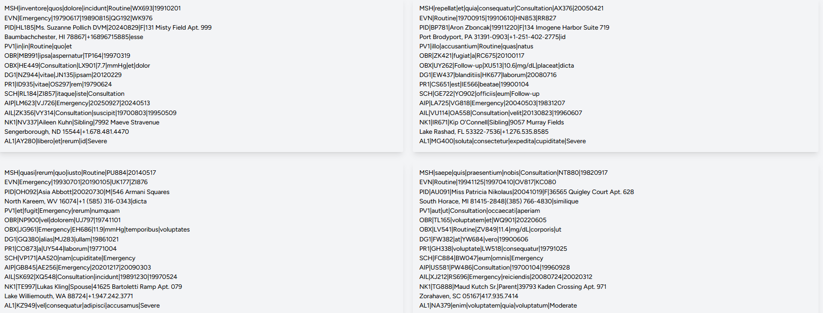 Generate a single HL7 message using your own data or our sample data. Preview and export it as a .HL7 file instantly!